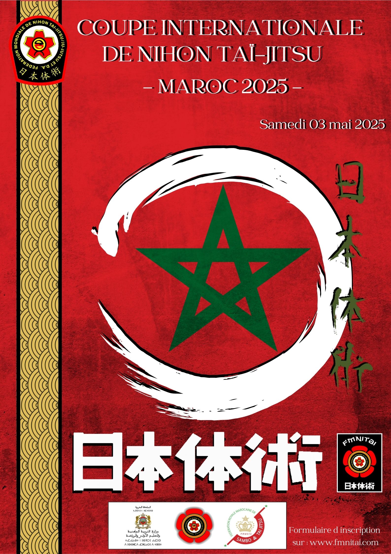 C’est avec une immense joie que la FMNITAI vous annonce la tenue de la prochaine Coupe Internationale de Nihon Taï-Jitsu, qui aura lieu au Maroc le samedi 3 mai 2025. Cet événement majeur rassemblera les passionnés et compétiteurs du monde entier, pour une journée placée sous le signe de l’excellence martiale, du respect et du partage.